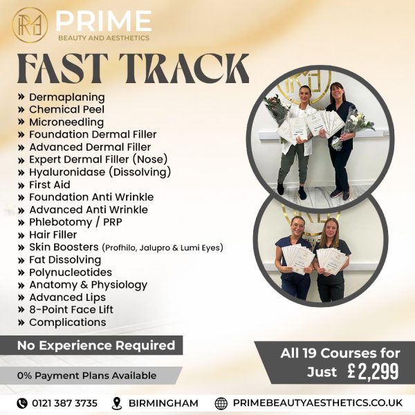 Our Fast Track Aesthetics Training Course is delivered at our Birmingham training academy, welcoming students from across the UK who are looking for high-quality, hands-on aesthetics training in a supportive and professional environment.